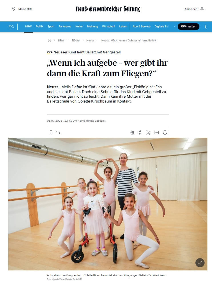 Nach dem Dreh in unserer Ballettschule am Dienstag, dem 16.09.25, wurde der Beitrag nur wenige Tage später ausgestrahlt. Aufmerksam geworden ist der WDR auf uns über den Bericht in der NGZ vom 01.07.25 „Tanz ins Leben“ (siehe unter diesem Beitrag), in welchem ausführlich über unsere Schülerin Melis Defne berichtet wurde. Wer Interesse hat kann sich gerne hier den Bericht ansehen.